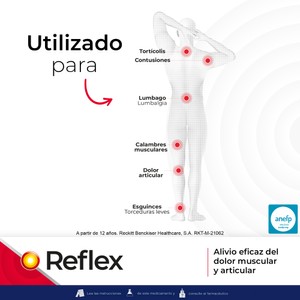 Reflex Spray está indicado en adolescentes a partir de 12 años y en adultos, para el alivio del dolor de los músculos y articulaciones en: contusiones, torceduras y esguinces leves, traumatismo (golpes) sin herida abierta, calambres musculares, tortícolis, dolor de espalda y lumbagia (dolor en la zona baja de la espalda).